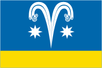 Полотнище синего (голубого) цвета с отношением ширины к длине 2:3, несущее вдоль нижнего края жёлтую полосу в 1/4 полотнища, а посередине основной, синей (голубой) части - белое изображение фонтана с двумя струями, под ниспадающими частями которого две белых восьмилучевых звезды.