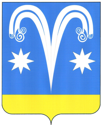 В лазоревом поле над золотой оконечностью - серебряный фонтан о двух струях, сопровождаемый по сторонам под ниспадающими частями струй, восьмилучевыми звездами того же металла.
